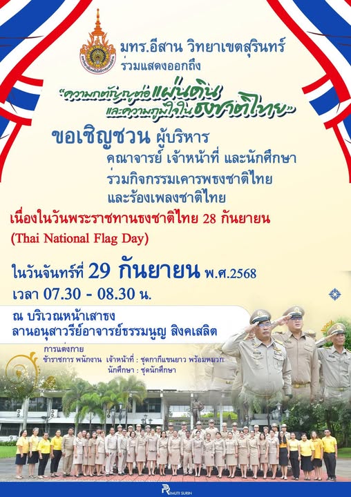 แจ้งประชาสัมพันธ์ขอเชิญชวน ผู้บริหาร คณาจารย์ เจ้าหน้าที่ และนักศึกษา ร่วมกิจกรรมเคารพธงชาติไทย และร้องเพลงชาติไทย เนื่องในวันพระราชทานธงชาติไทย 28 กันยายน (Thai National Flag Day)