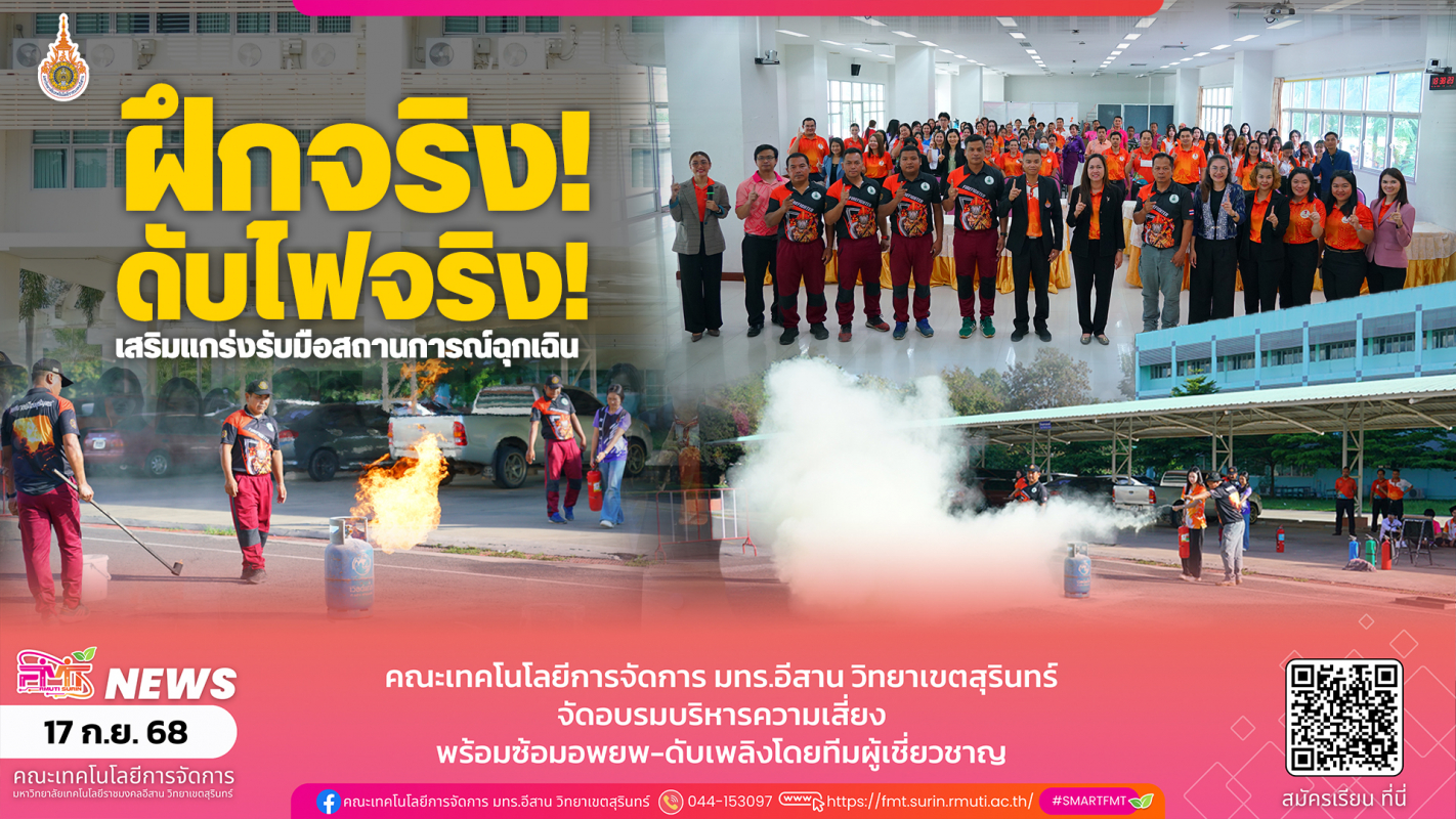 <p data-start="285" data-end="758"><span style="font-size: 13pt; font-family: Kanit;"> วันที่ 17 กันยายน 2568 คณะเทคโนโลยีการจัดการ มหาวิทยาลัยเทคโนโลยีราชมงคลอีสาน วิทยาเขตสุรินทร์ จัดโครงการ <strong data-start="399" data-end="500">“อบรมเชิงปฏิบัติการเพื่อเพิ่มศักยภาพในการบริหารความเสี่ยงอย่างมืออาชีพ ประจำปีงบประมาณ พ.ศ. 2568”</strong> ณ ห้องประชุมช้างชมพู คณะเทคโนโลยีการจัดการ โดยได้รับเกียรติจาก <span> <strong data-start="702" data-end="756">อาจารย์ ดร.ภรณี หลาวทอง คณบดีคณะเทคโนโลยีการจัดการ</strong></span> เป็นประธานในพิธีเปิด ซึ่งจัดขึ้นตามนโยบายของคณะฯ</span></p> <p data-start="760" data-end="796"><span style="font-size: 13pt; font-family: Kanit;"> โครงการดังกล่าวมีวัตถุประสงค์เพื่อ</span></p> <ol data-start="797" data-end="1127"> <li data-start="797" data-end="920"> <p data-start="800" data-end="920"><span style="font-size: 13pt; font-family: Kanit;">ส่งเสริมและพัฒนาบุคลากรให้มีความรู้ ความเข้าใจ และทักษะในการบริหารความเสี่ยงทั้งภายในและภายนอกองค์กรอย่างมีประสิทธิภาพ</span></p> </li> <li data-start="921" data-end="991"> <p data-start="924" data-end="991"><span style="font-size: 13pt; font-family: Kanit;">เพิ่มศักยภาพในการตรวจสอบและบำรุงรักษาอุปกรณ์ดับเพลิงอย่างมืออาชีพ</span></p> </li> <li data-start="992" data-end="1127"> <p data-start="995" data-end="1127"><span style="font-size: 13pt; font-family: Kanit;">ให้บุคลากรและนักศึกษาได้ฝึกปฏิบัติการอพยพตามแผนฉุกเฉิน รวมถึงฝึกซ้อมการดับเพลิง เพื่อเตรียมความพร้อมในการรับมือกับสถานการณ์ฉุกเฉิน</span></p> </li> </ol> <p data-start="1129" data-end="1440"><span style="font-size: 13pt; font-family: Kanit;"> ในการอบรมครั้งนี้ มีผู้เข้าร่วมจำนวนกว่า 100 คน ประกอบด้วยบุคลากรสายวิชาการ สายสนับสนุน และนักศึกษาคณะเทคโนโลยีการจัดการ โดยได้รับเกียรติจาก <strong data-start="1270" data-end="1350">พันจ่าเอกสมชาย งามมี หัวหน้างานป้องกันและบรรเทาสาธารณภัย เทศบาลเมืองสุรินทร์</strong> พร้อมด้วยทีมงานป้องกันและบรรเทาสาธารณภัย เป็นวิทยากรให้ความรู้ทั้งภาคทฤษฎีและภาคปฏิบัติ<br /><br /></span></p> <hr /> <p><span style="font-family: Kanit; font-size: 13pt;">สามารถรับชมและดาวน์โหลดภาพทั้งหมดได้ที่</span></p> <p>https://photos.app.goo.gl/yQ2aNuhBqBWALLKk8</p> <hr /> <p></p>
