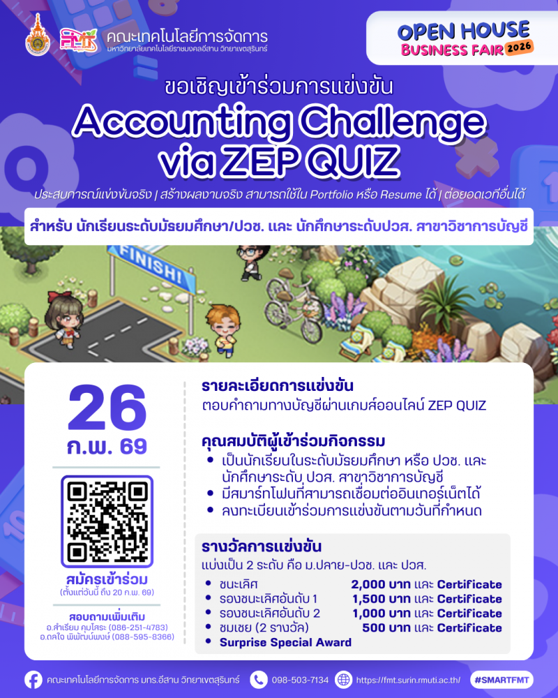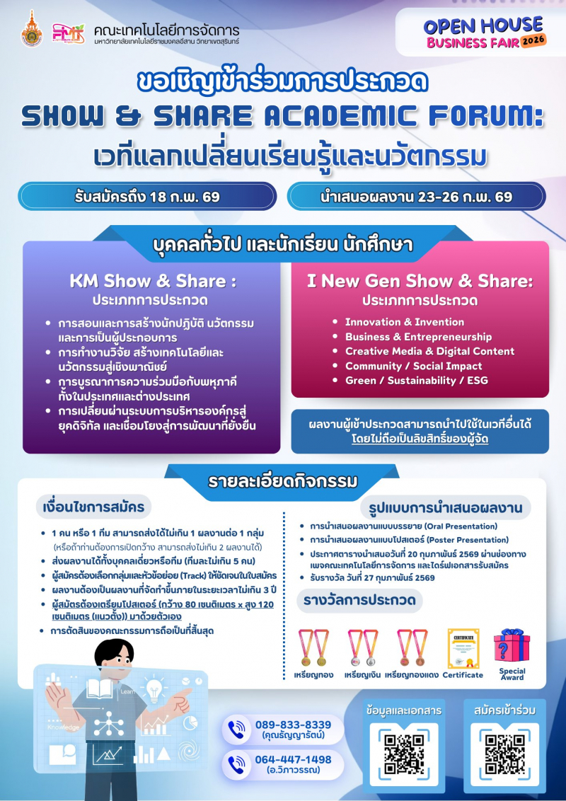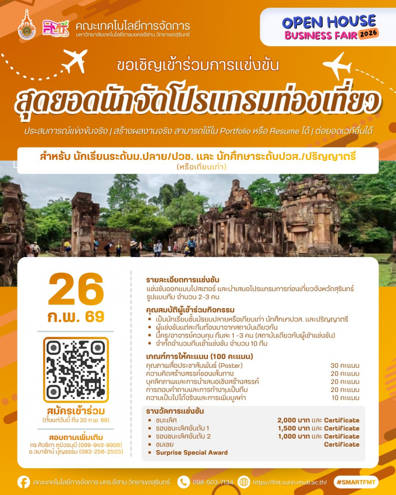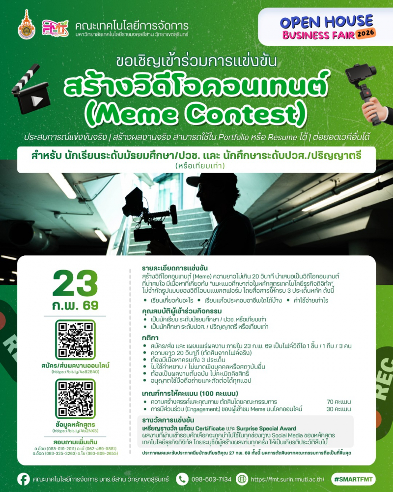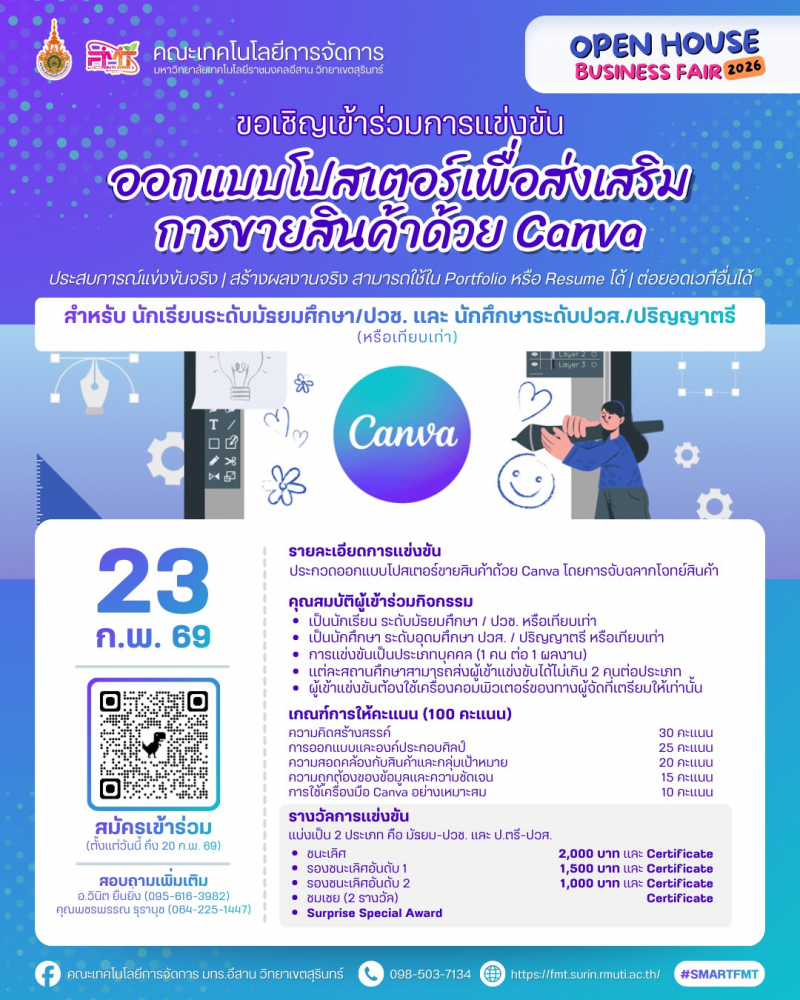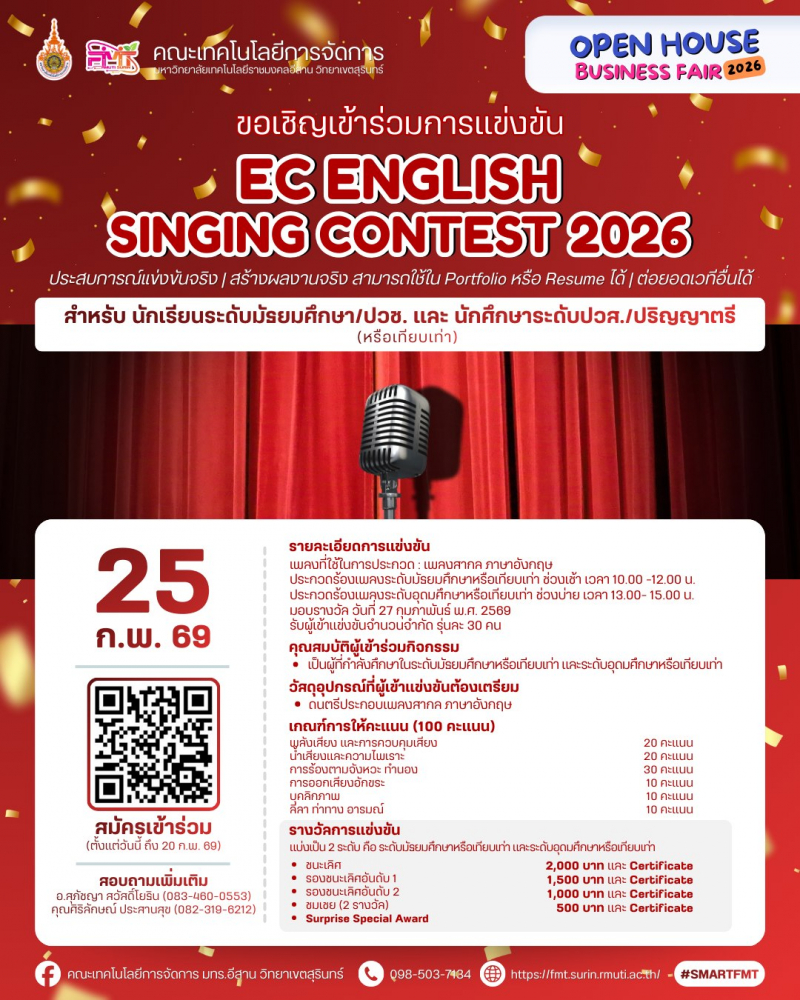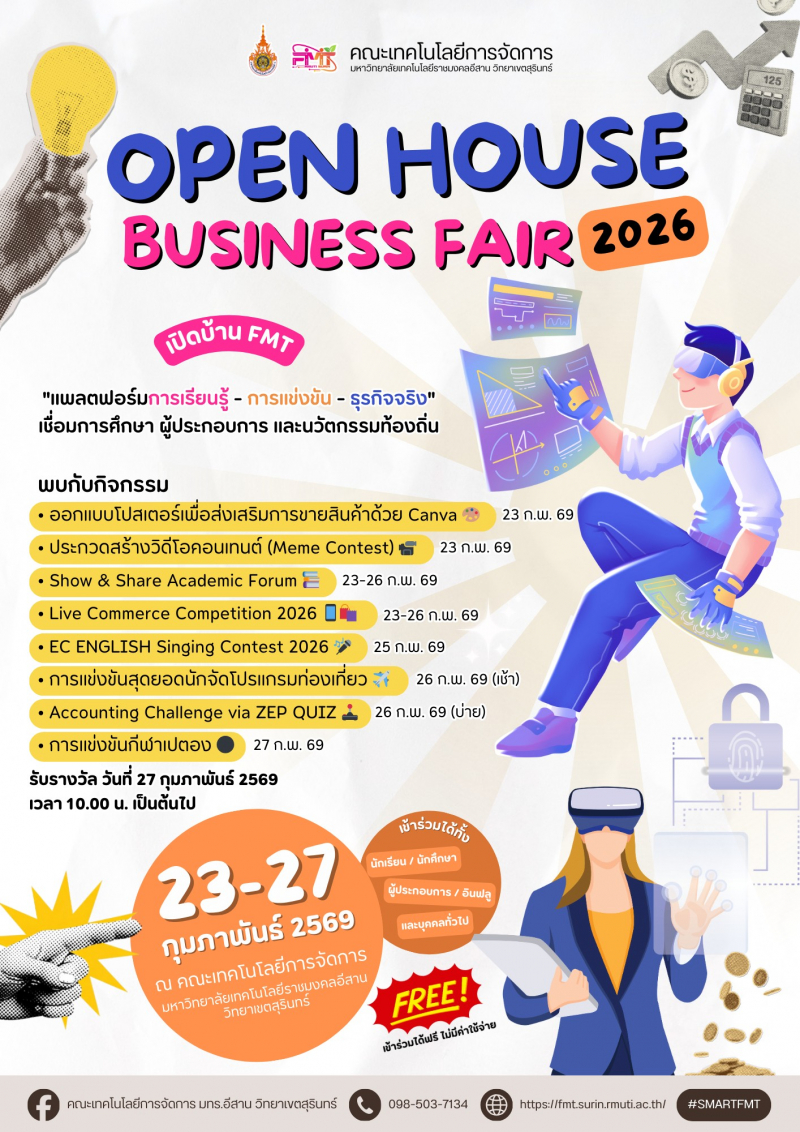 <span style="font-size: 14pt;"><strong>เปิดบ้าน เปิดโอกาส เปิดประสบการณ์ใหม่</strong></span><br /><span style="font-size: 14pt;"><strong>Open House Business Fair 2026</strong></span><br /><br /><span style="font-size: 13pt;"><strong>ขอเชิญ</strong></span><br /><strong>นักเรียน • นักศึกษา • ผู้ประกอบการ • อินฟลูเอนเซอร์ • ภาคีเครือข่าย</strong><br /><strong>และบุคคลทั่วไป </strong>ที่สนใจด้านธุรกิจ ความคิดสร้างสรรค์ ภาษา การท่องเที่ยว บัญชี กีฬา และการขายออนไลน์<br /><br /><span style="font-size: 13pt;"><strong>เข้าร่วมงานได้ฟรี! ไม่มีค่าใช้จ่าย</strong></span><br /><br />วันที่ <strong>23–27 กุมภาพันธ์ 2569</strong><br />ณ คณะเทคโนโลยีการจัดการ มหาวิทยาลัยเทคโนโลยีราชมงคลอีสาน วิทยาเขตสุรินทร์<br /><br />ภายในงานพบกับกิจกรรมสร้างสรรค์และการแข่งขันบนเวทีจริง<br />เหมาะสำหรับผู้ที่อยาก ลองสนามจริง สร้างผลงานจริง และต่อยอดอนาคต<br /><br /><span style="font-size: 13pt;"><strong>กิจกรรมภายในงาน</strong></span><br />• การแข่งขันออกแบบโปสเตอร์เพื่อส่งเสริมการขายสินค้าด้วย Canva<br />• การแข่งขันสร้างวิดีโอคอนเทนต์ (Meme Content)<br />• Show & Share Academic Forum: เวทีแลกเปลี่ยนเรียนรู้และนวัตกรรม<br />• Live Commerce Competition 2026<br />• EC ENGLISH Singing Contest 2026<br />• การแข่งขันสุดยอดนักจัดโปรแกรมท่องเที่ยว<br />• Accounting Challenge via ZEP QUIZ<br />• การแข่งขันกีฬาเปตอง<br /><br /><span style="font-size: 13pt;"><strong>ผู้เข้าร่วมแข่งขันจะได้รับ</strong></span><br />• ประสบการณ์แข่งขันจริง บนเวทีจริง<br />• ผลงานจริง สามารถนำไปต่อยอดเวทีอื่น ๆ<br />• ใช้ประกอบ Portfolio หรือ Resume ได้<br />• เปิดโอกาสสร้างเครือข่ายและแรงบันดาลใจใหม่ ๆ<br /><br />มาเปิดประสบการณ์ เรียนรู้ สนุก และสร้างโอกาสให้ตัวเองไปพร้อมกัน<br />แล้วพบกันที่ Open House Business Fair 2026 นะคะ/ครับ<br /><br /><strong>https://heyzine.com/flip-book/ac8293400d.html</strong>