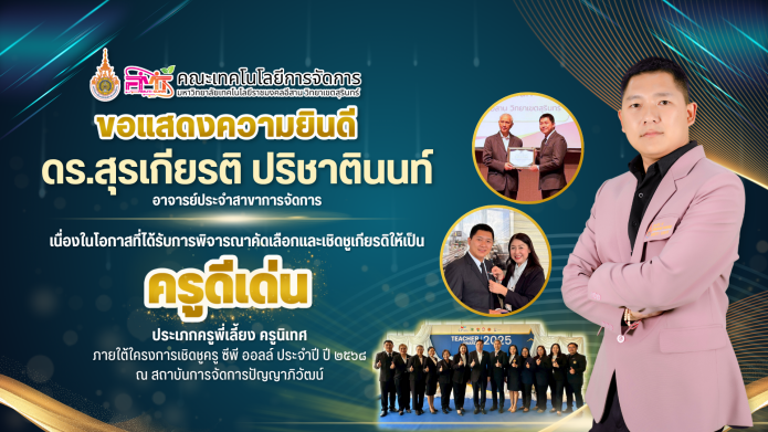 ขอแสดงความยินดี ดร.สุรเกียรติ ปริชาตินนท์ อาจารย์ประจำสาขาการจัดการ ในโอกาสที่ได้รับการพิจารณาคัดเลือกและเชิดชูเกียรติให้เป็น ครูดีเด่น ประเภทครูพี่เลี้ยง ครูนิเทศ